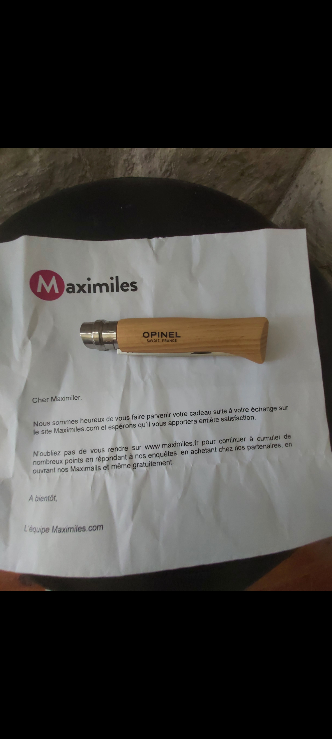 « J'ai reçu vendredi matin le couteau Opinel grâce à mes points aux sondages Maximiles livré par colissimo merci à eux et au Génie. »