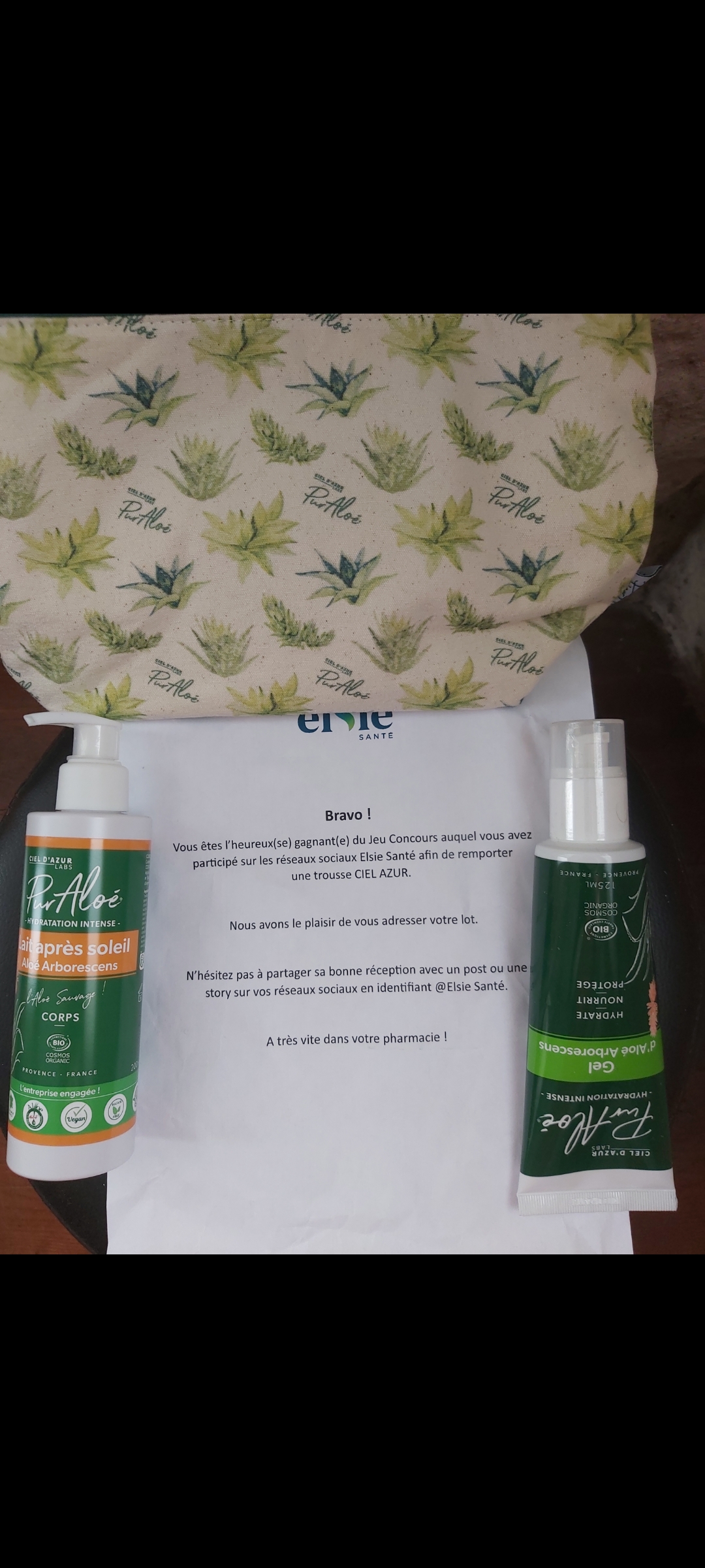 « Reçu la trousse concernant 2 produits : un gel hydratant aloé vera et le soin après soleil gagné au concours Elsie Santé sur Facebook merci à eux et au Génie. »