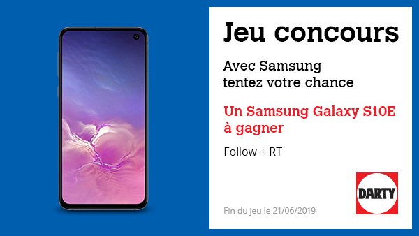 Bienvenue dans une nouvelle ère, avec @SamsungFR on a envie de vous faire plaisir ! Tentez de gagner un #SamsungGalaxyS10E avec son écran Super Amoled ! Pour jouer : Follow + RT @SamsungFR ainsi que @Darty_officiel À vous de jouer ! TAS le 21/06.