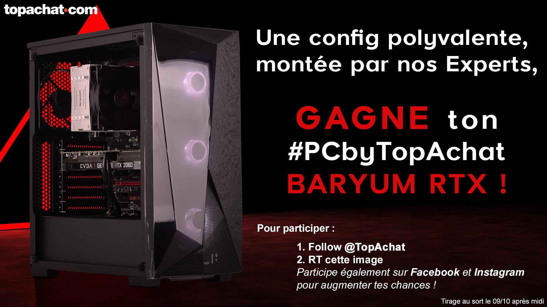 🎁 #Concours 🎁 Une config polyvalente, montée par nos Experts, Gagne ton #PCbyTopAchat BARYUM RTX ! ✅ Follow @TopAchat ✅ #RT cette image Augmente tes chances en participant aussi sur Instagram et Facebook https://t.co/XkIFhWiGNk Tirage au sort le 09/10 après-midi