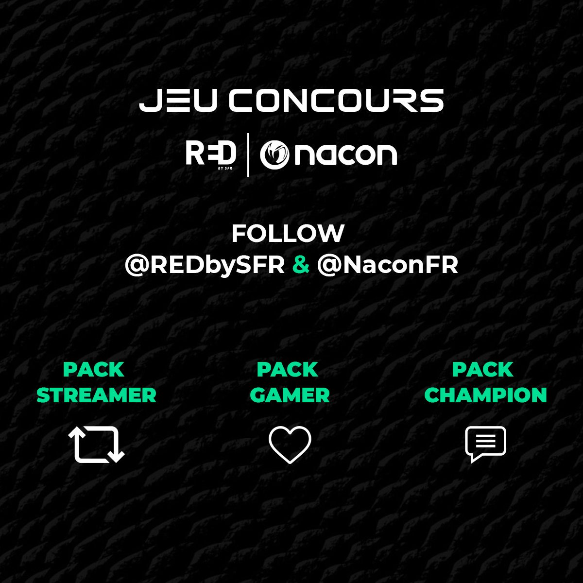 [#Concours 🎮] Pour célébrer l'eSport et le gaming, on vous propose un petit jeu avec Nacon ! Suivez @REDbySFR et @NaconFR et tentez de gagner le pack de votre choix via RT, Like ou Commentaire. Ou les trois. 😏 Fin du jeu et tirage au sort le 4/11 à 16h.