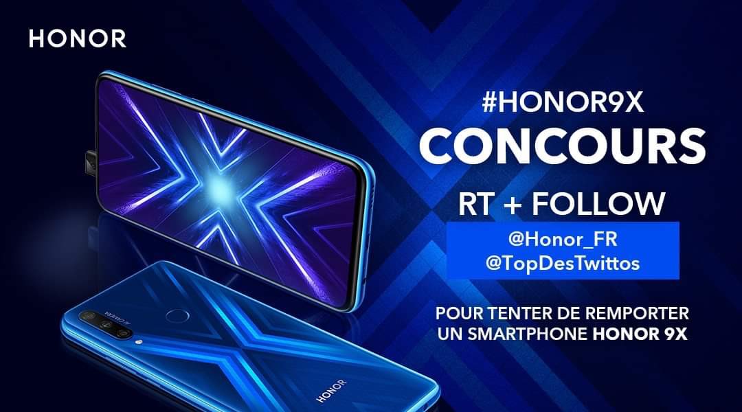 Concours Twitter : RT le tweet + Follow 2 comptes et déposez une commentaire avec le #HONOR9X pour participer au tirage au sort.