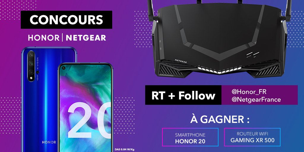 • 1 smartphone Honor 20 avec 1 routeur WiFi Nighthawk XR500 de Netgear