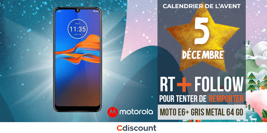 JOUR 5 🎁 À gagner pour le #CalendrierDeLAventCdiscount : Motorola MOTO E6+ Gris métal 64 Go 🍀 👉 https://t.co/WPByppRjLd Pour tenter votre chance : RT ce tweet + Follow @Cdiscount Tirage au sort : 09/12🕒 Règlement: https://t.co/0V0m07fHPf
