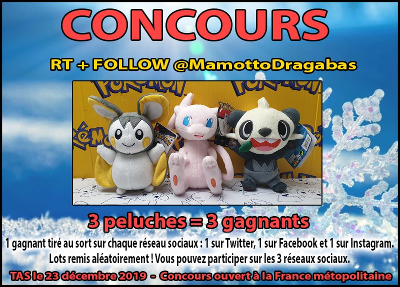 CONCOURS DE NOËL ! 3 peluches = 3 gagnants 🔸️RT + FOLLOW @MamottoDragabas 🔸️1 gagnant sur chaque réseau social 🔸️TAS le 23 décembre 🔸️Vous pouvez participer sur Facebook https://t.co/8gOyD9ocIb et Instagram https://t.co/9B6Se2gLGn 🔸️Réservé à la France Métropolitaine