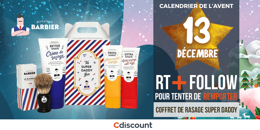 JOUR 13 🎁 À gagner pour le #CalendrierDeLAventCdiscount : Un coffret de rasage Super Daddy MONSIEUR BARBIER🍀 👉 https://t.co/DBkkcOGt9I Pour tenter votre chance : RT ce tweet + Follow @Cdiscount Tirage au sort : 16/12🕒 Règlement: https://t.co/3mXbWtFR47