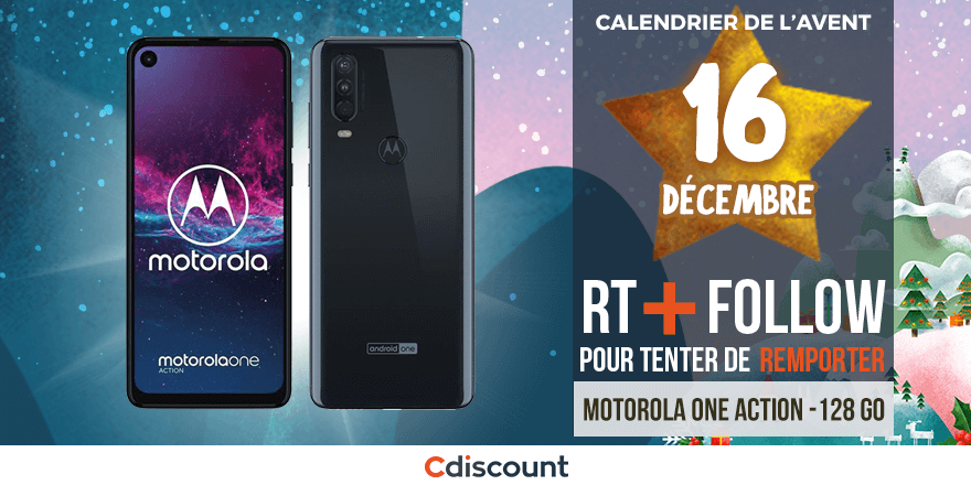 JOUR 16 🎁 À gagner pour le #CalendrierDeLAventCdiscount : Un Motorola One Action 128 Go 🍀 👉 https://t.co/qEqEhKGsqP Pour tenter votre chance : RT ce tweet + Follow @Cdiscount Tirage au sort : 18/12🕒 Règlement: https://t.co/5NzkrphSKF