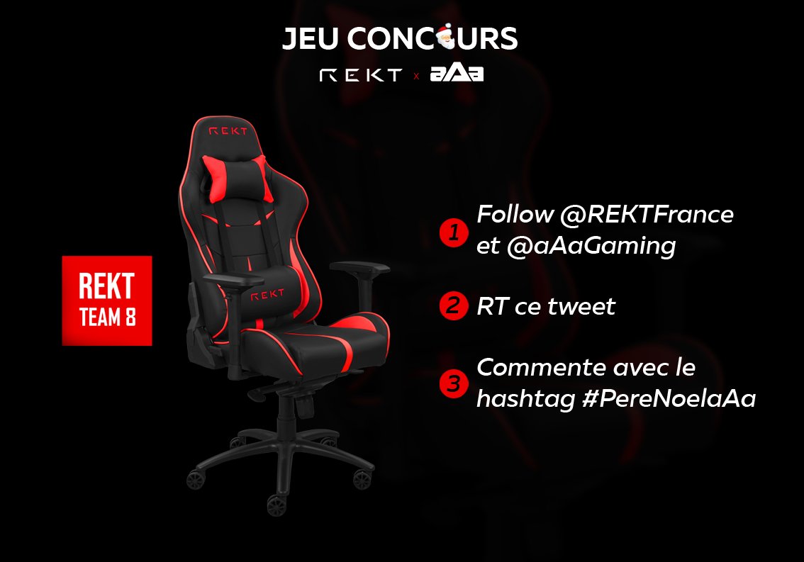 #Concours ! Le Père Noël approche ! Tentez de remporter un super siège gaming REKT Team8 ! Pour participer : 1⃣ Follow @REKTFrance & @aAaGaming 2⃣ RT ce tweet 3⃣ Commente ce tweet avec le hashtag #PereNoelaAa TAS le 20/12, bonne chance !