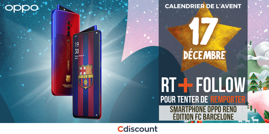 JOUR 17 🎁 À gagner pour le #CalendrierDeLAventCdiscount : Un smartphone Oppo Reno FC Barcelone 🍀 👉 https://t.co/MCghfglvIu Pour tenter votre chance : RT ce tweet + Follow @Cdiscount Tirage au sort : 19/12🕒 Règlement: https://t.co/nviiyrMBGM