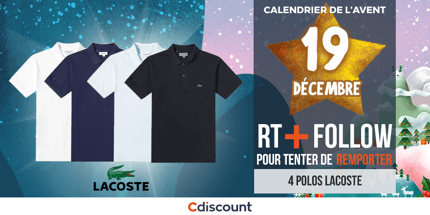 JOUR 19 🎁 À gagner pour le #CalendrierDeLAventCdiscount : 4 polos Lacoste 🍀 👉 https://t.co/7cCL4sbGqn Pour tenter votre chance : RT ce tweet + Follow @Cdiscount Tirage au sort : 23/12 🕒 Règlement : https://t.co/S16lu1I8vO
