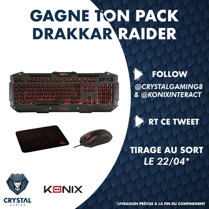 [#Concours 🎁] C’est Pâques man ! Pour l’occasion, nous vous faisons gagner un pack Konix Drakkar Raider (clavier, souris et tapis) ! ⌨️ 👉 Follow @crystalgaming8 et @KonixInteract 🔁 RT pour avoir une chance de le gagner 🎁 Tirage au sort le 22 avril