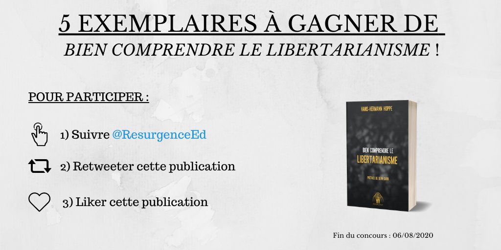 🎉 5 exemplaires de "Bien comprendre le libertarianisme" à gagner ! 🎁 Pour participer : 1) Suivre @ResurgenceEd 2) Retweeter cette publication 3) Liker cette publication Gagnant annoncé le 06/08/2020. #libertarianisme #liberté #libertarien #éditionsRésurgence #résurgence