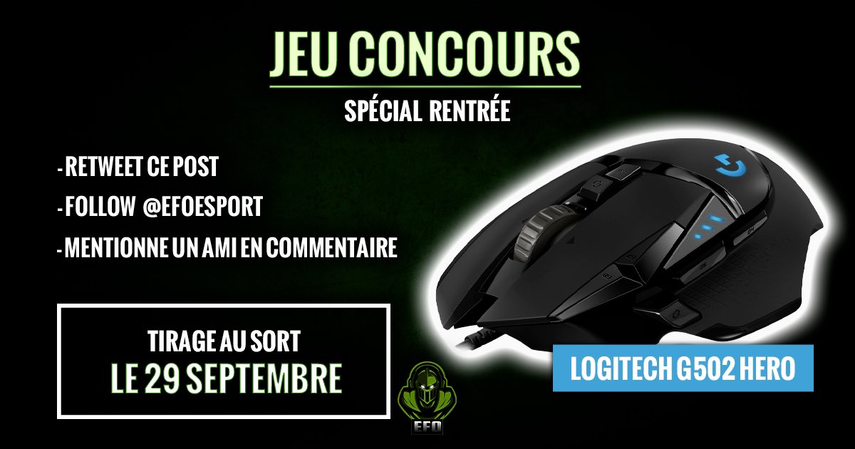Bonjour à tous 👋 Afin de fêter notre retour, nous vous organisons un #concour pour gagner une souris Logitech G502 🤩 - Follow @EFOEsport - #RT le tweet - Mentionne 1 ami Tirage le 29 septembre 2020 ✅
