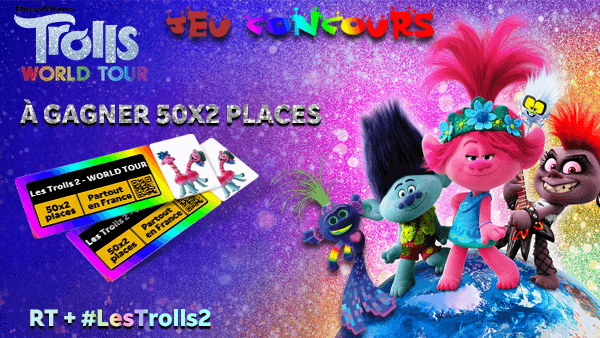 Concours Twitter : Tweet avec #LesTrolls2 et une GIF "Trolls" pour participer au tirage au sort.