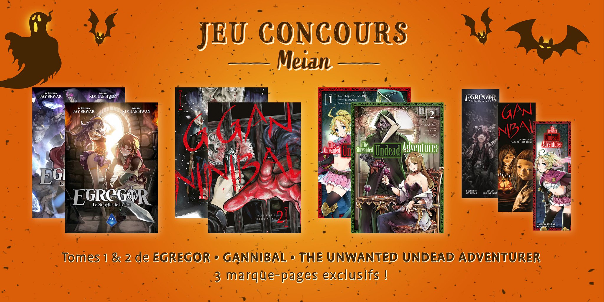 • 5 x 6 mangas "Egregor T1 & 2" et "Gannibal T1 & 2" puis The Unwanted Undead Adventurer T1 & 2" avec es marques pages