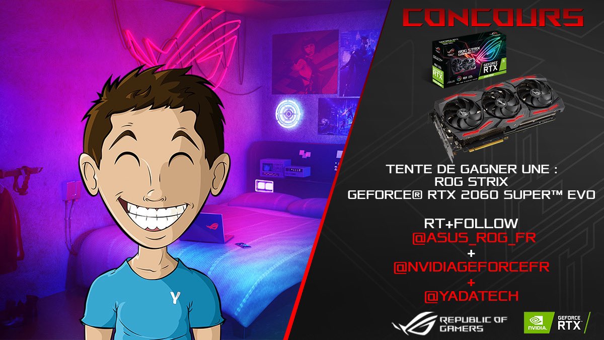 🎁 Concours 🎁 Avec Nvidia & ROG, on vous fait gagner une ROG Strix GeForce® RTX 2060 SUPER™ GAMING ! 🔥 ▶️ https://t.co/xdfTmlmveE Pour participer les règles sont simples 👇🏼 - #RT ce tweet - Follow @YadaTech - Follow @ASUS_ROG_FR - Follow @NVIDIAGeForceFR 🍀 T.A.S : 30/10