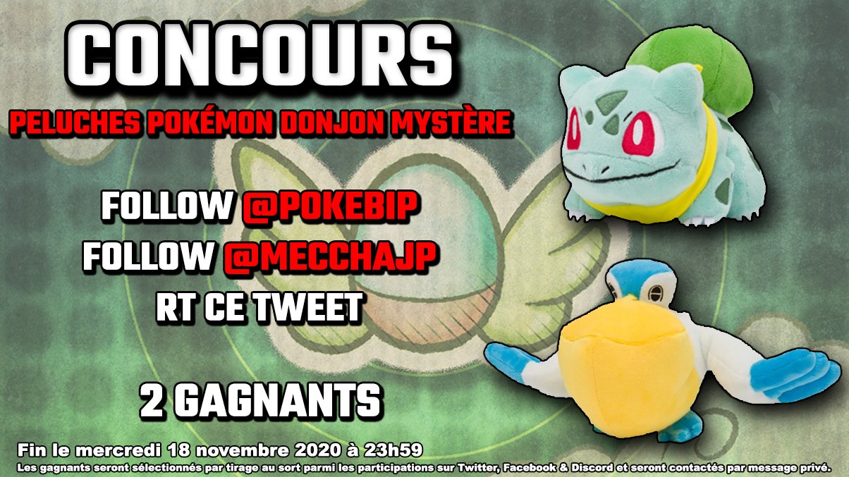 [CONCOURS] Gagne une peluche #PokémonDonjonMystèreDX Bulbizarre ou Békipan Pour participer : • Follow @Pokebip • Follow @mecchaJP • RT ce Tweet 2 gagnants seront tirés au sort parmi les participations sur Twitter, Facebook & Discord Fin le mercredi 18/11/2020 à 23h59 !