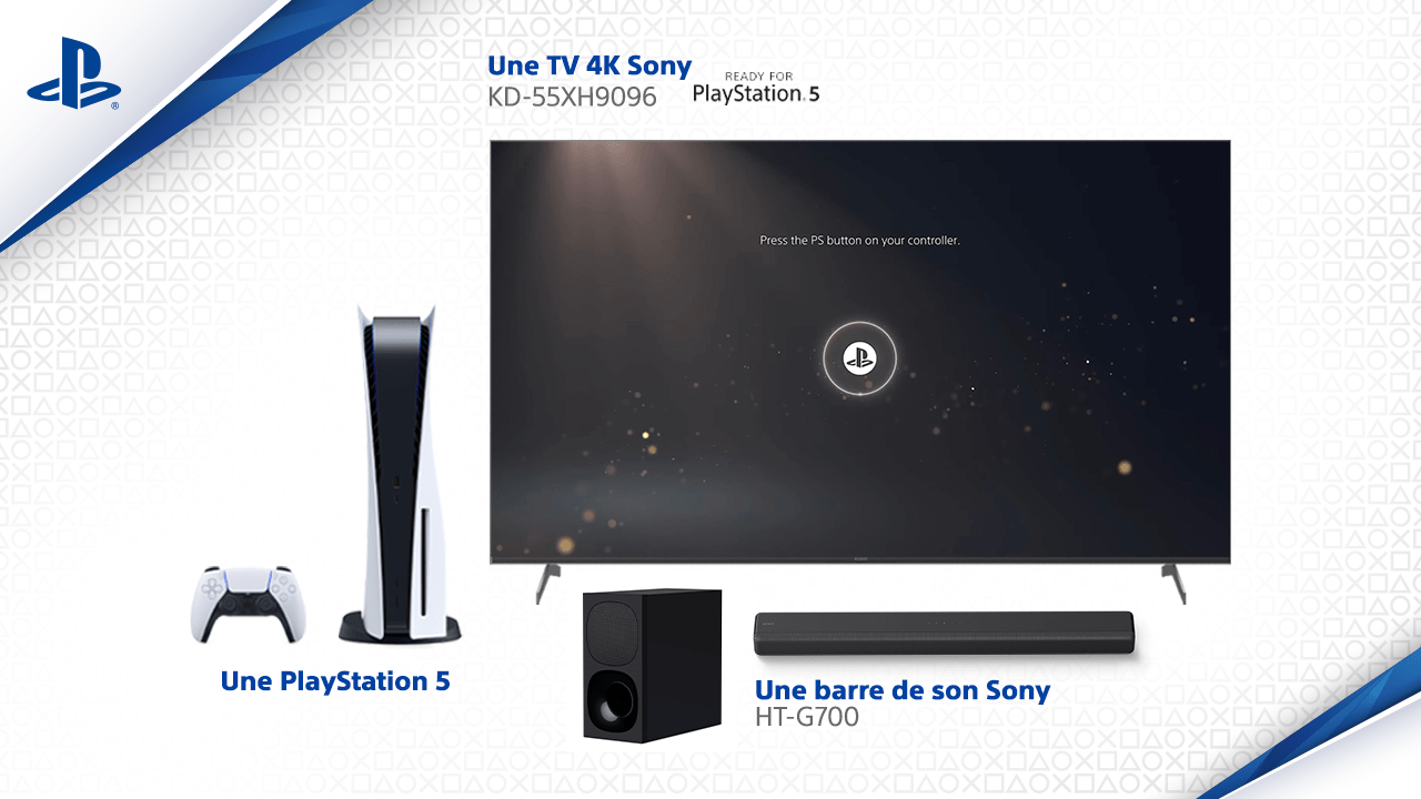 • 1 lot composé de 1 console de jeux PS5 + 1 TV 4K Sony + 1 barre de son