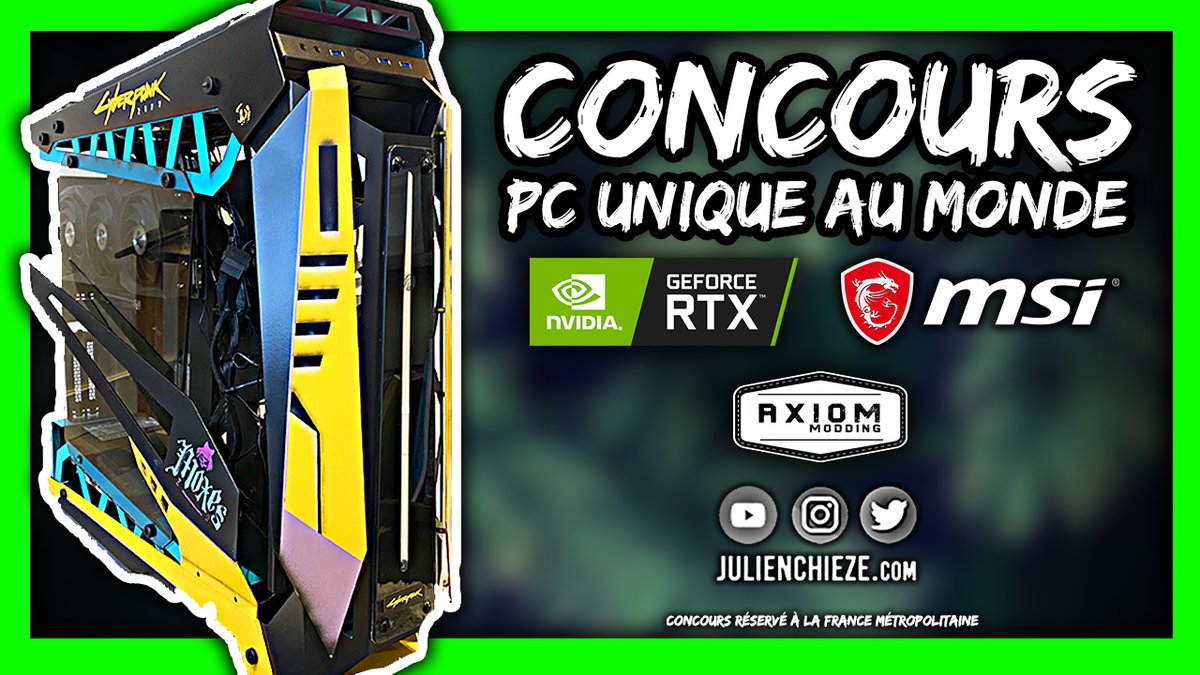 ÉNORME #CONCOURS 🎁 Je mets en jeu un PC unique au MONDE customisé par @AxiomModding 😍 Pour participer ✅RT + Follow @JulienChieze + @msifrance + @NVIDIAGeForceFR ✅Être abonné à ma chaîne YouTube https://t.co/WRMyJjH2oi Bonne chance à tous 💚 TAS 26/01 #RTXOn