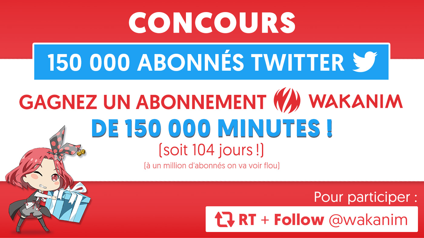 🎉 JEU CONCOURS 150K ABONNÉS ! 🎉 Merci à toutes et à tous ! Pour marquer le coup : gagnez 150 000 minutes d'abonnement Wakanim ! (et continuez à nous suivre, voyons jusqu'où on peut aller !) 🎁 Pour participer il vous suffit de : RT + Follow @Wakanim TaS le 27/01/20