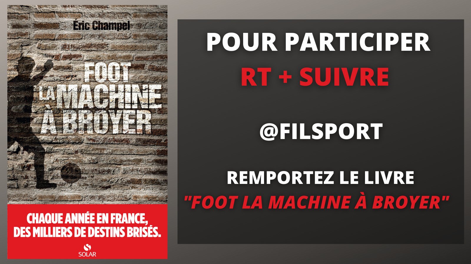 🎁#Concours Bonne nouvelle @FilSport fait gagner "Foot la Machine à Broyer" @SOLAReditions Pour participer, c'est très simple : ✅Like+RT+follow @FilSport participez aussi via notre page FB https://t.co/Hd8SWyF9E5 #Giveaway #cadeau #JeuConcours #gift #foot #lecture #livre