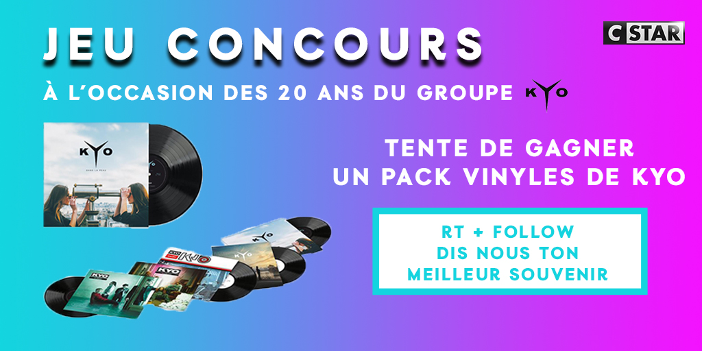 🚨 JEU CONCOURS Pour les 20 ans de @KYO_officiel, nous vous proposons de gagner des packs vinyles du groupe ! 😎 Pour tenter de gagner le pack : ☑ RT + FOLLOW @CSTAR ☑ Raconte-nous ton meilleur souvenir avec Kyo ☑ Mentionne un ami fan du groupe Bonne chance 🍀