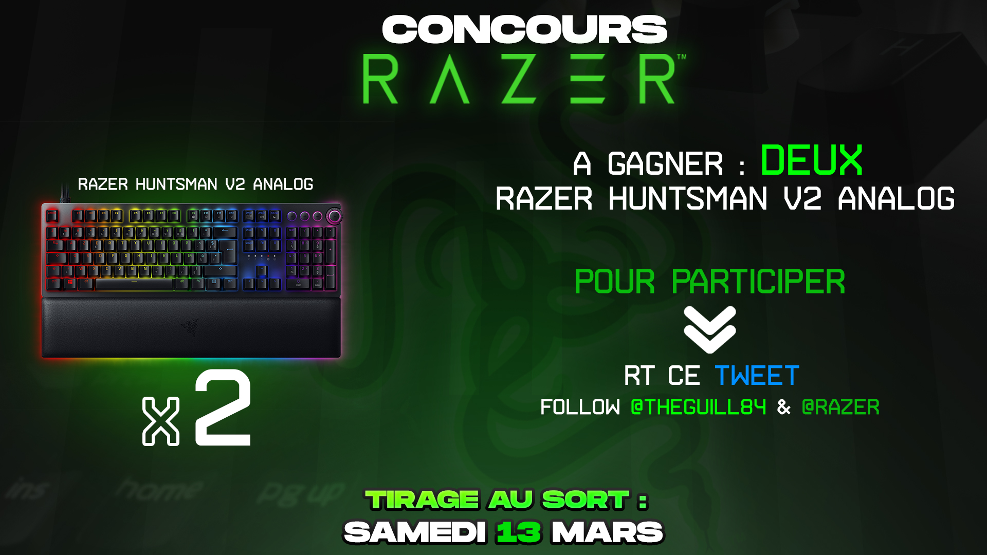 Nouveau concours #Razer : Deux nouveaux claviers Razer Huntsman V2 Analog pour vous ! Pour participer : 🔁 RT + Follow @TheGuill84 et @RazerFrance ⌛ Tirage au sort SAMEDI 13/03 à 18H !