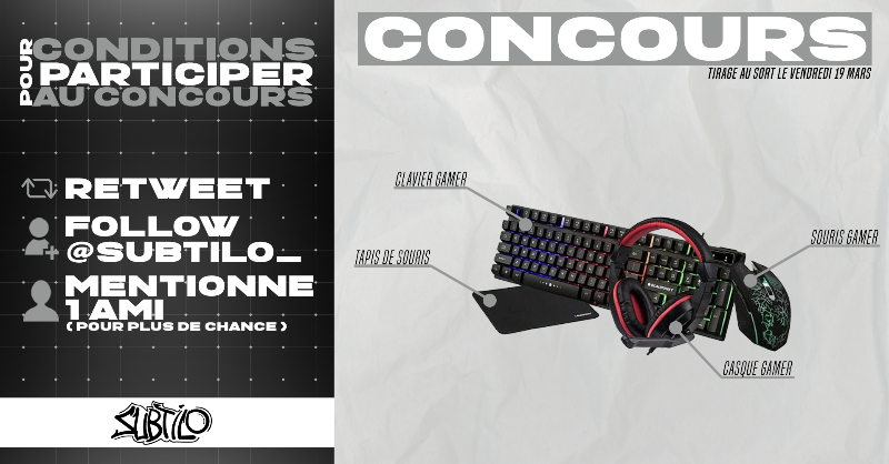 #Concours 🎁 Gagne ton Pack Gaming complet 🤩 (Clavier, Souris, Tapis de souris et Casque) Pour participer : ✅ #RT ✅ #FOLLOW @Subtilo_ ✅ #MENTIONNE UN AMI(E) (Pour plus de chances !) Tirage au sort le 19 Mars 2021 ! #Bonne #Chance 🍀