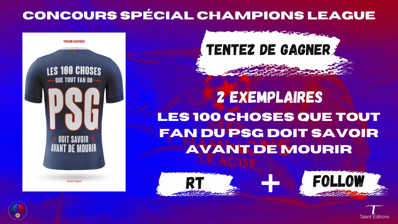 🔴🔵Concours spécial Ligue des champions, tentez de gagner l'un des deux exemplaires du livre : "Les 100 choses que tout fan du PSG doit savoir avant de mourir" ✅ RT&❤️ ce post. ✅ Follow @TalentEditions et @parisunited6 ✅ TAS ce samedi‼️