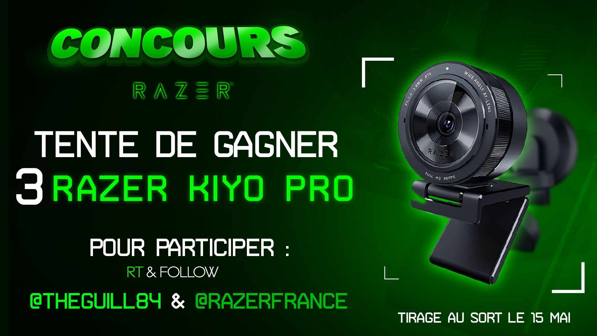 Nouveau concours #Razer, ça faisait longtemps ! TROIS caméras Razer Kiyo Pro avec une qualité de folie d'une valeur de 210€ chacune ! Pour participer : 🔁 RT + Follow @TheGuill84 et @RazerFrance ⌛ Tirage au sort SAMEDI 15/05 !