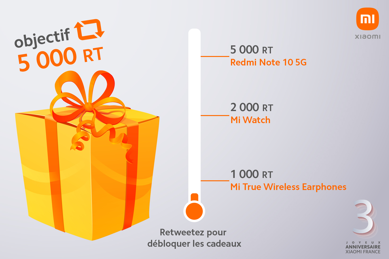 Concours spécial 3ᵉ anniversaire Xiaomi France ! 🥳 - 1 000 RT 👉 1x Mi True Wireless Earphones - 2 000 RT 👉 1x Mi Watch - 5 000 RT 👉 1x Redmi Note 10 5G Pour participer c'est simple : - 🔄 RT et follow @XiaomiFrance Un gagnant sera tiré au sort le 28 mai 🤞
