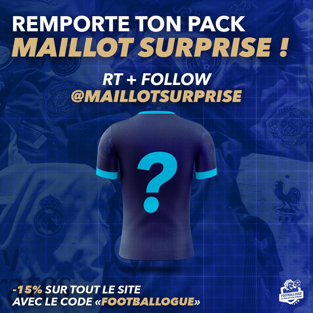 [#JeuConcours🎁] RT + Follow @MaillotSurprise pour tenter de gagner un des 5 packs Maillot Surprise mis en jeu ! 👕 👉 5 packs avec 1 maillot surprise par pack 👉 -15% sur https://t.co/YpRYmAZDFH avec le code "FOOTBALLOGUE" 🍀 TAS le 30/05