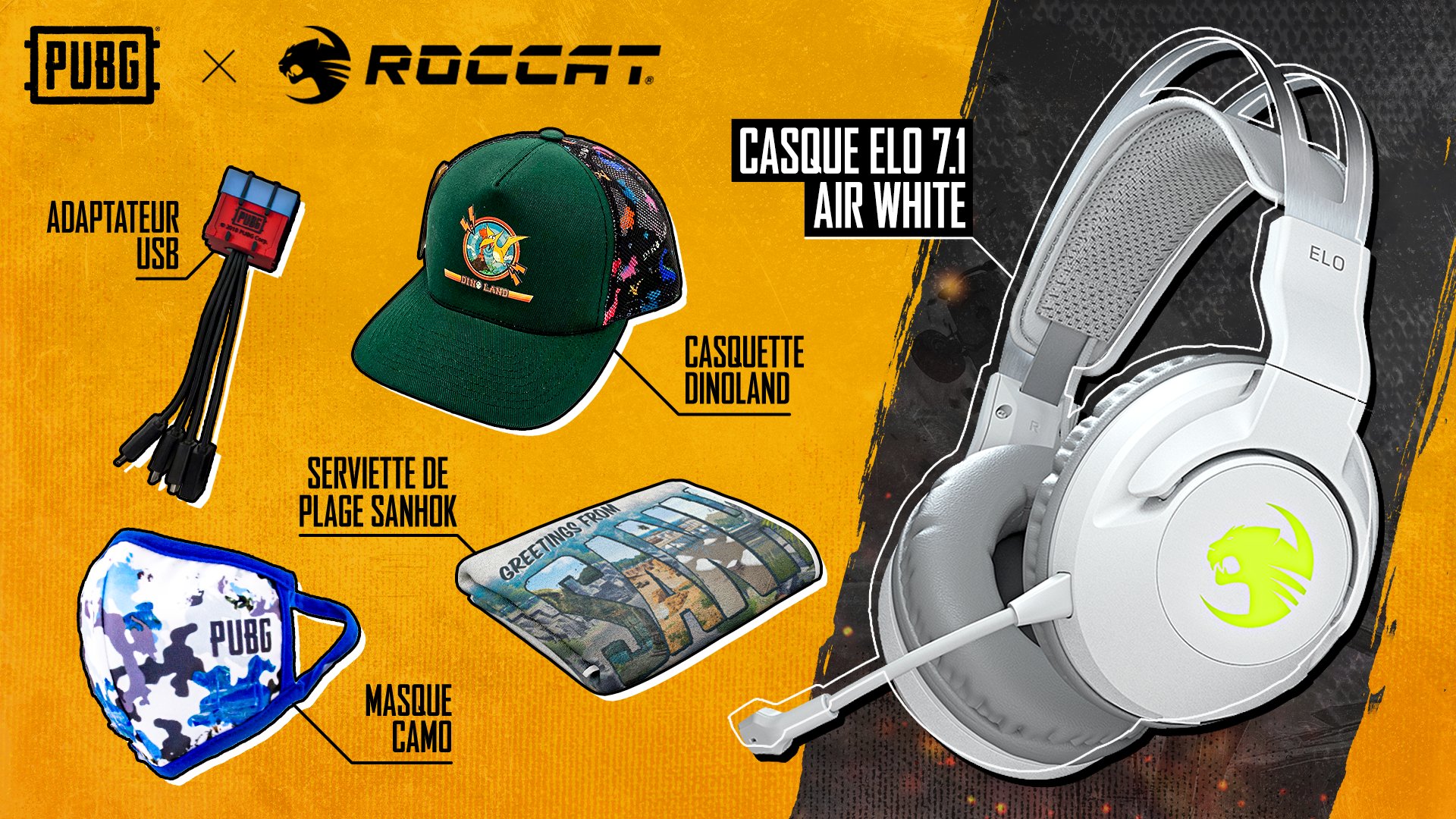 • 1 casque audio "Elo 7.1 Air" de chez Roccat avec des produits PUBG (serviette, casquette, masque, adaptateur usb)