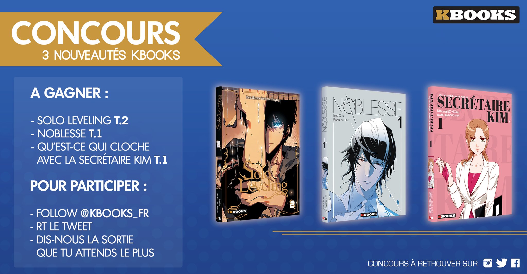 🎁🎁 #CONCOURS On vous fait gagner nos 3 prochaines sorties 😼 #noblesse #sololeveling #secretarykim 🍀 Follow @kbooks_fr ✌️ RT ce tweet 👇 Dis-nous la nouveauté que tu attends le plus Le gagnant remporte les trois tomes ! TAS le 9/06 📆