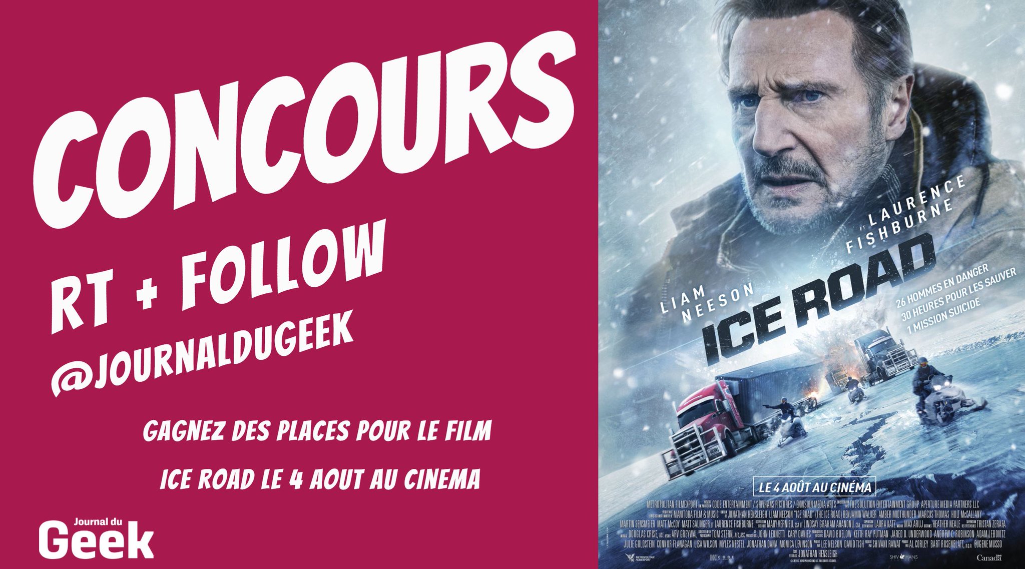 🎁#CONCOURS#🎁 Tentez de gagner des places de cinéma afin de découvrir le film #IceRoad qui sort le 4 août 2021 ! 👉Pour participer : RT & Follow @journaldugeek 👍Découvrez la bande-annonce : https://t.co/Ogi0RcZsh8 🍀Bonne chance à tous !