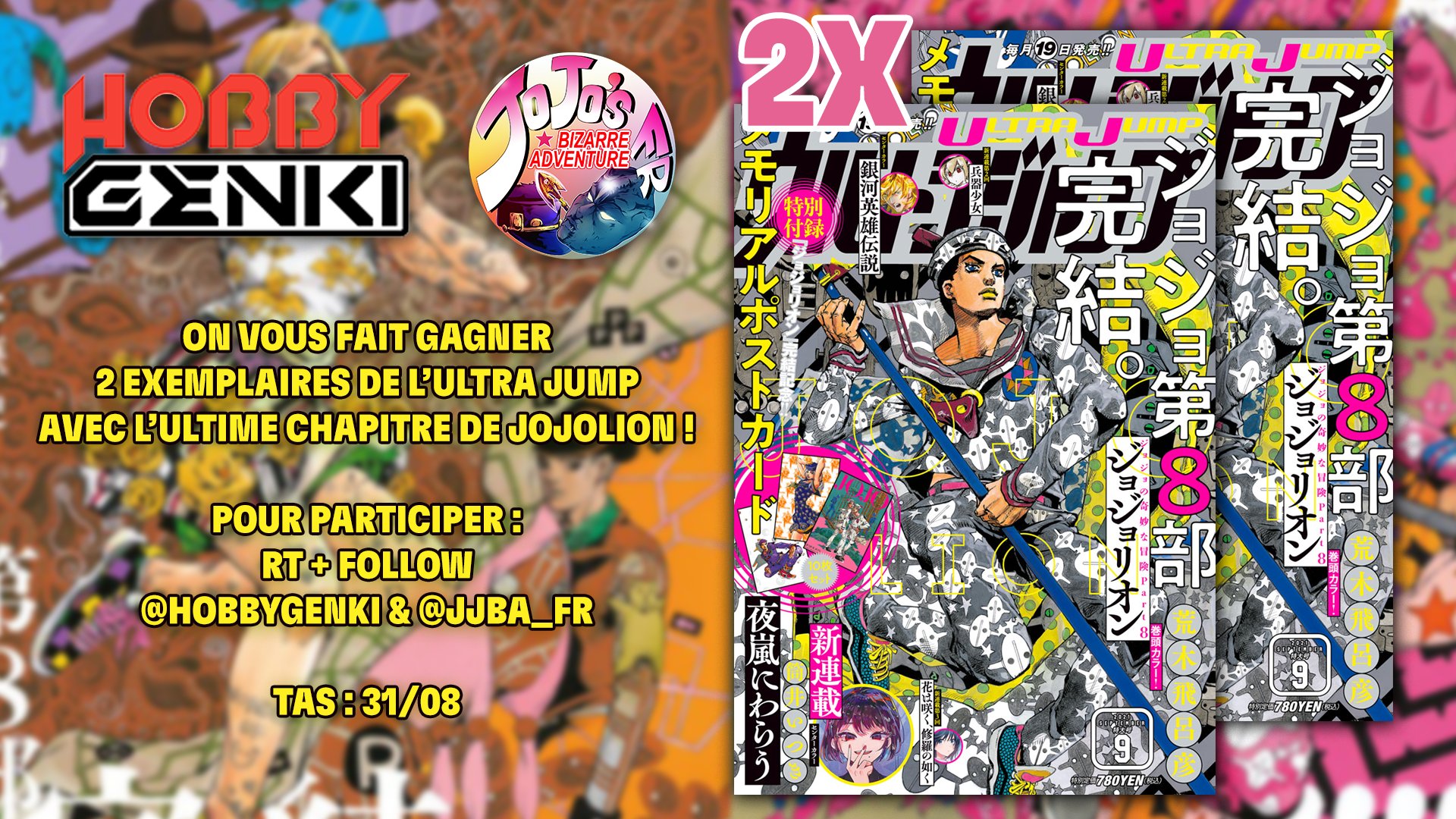🎁 CONCOURS ULTIME CHAPITRE JOJOLION 🎁 Tentez votre chance ! Avec Hobby-Genki, nous vous faisons remporter 2 exemplaires de l'Ultra Jump, avec le dernier chapitre de JoJolion ! ✨ Pour participer : RT + Follow : @HobbyGenki & @JJBA_FR ! TAS 31/08 ~ Rendez-vous à JoJolands !