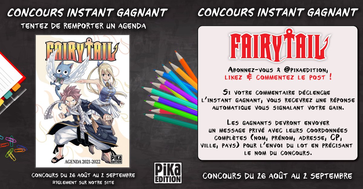 [CONCOURS INSTANT GAGNANT] FAIRY TAIL ⭐️ Les premières rentrées arrivent bientôt ! Si vous n'avez pas encore votre agenda ça tombe bien, nous vous proposons un jeu-concours pour tenter de remporter un agenda "Fairy Tail" 2021-2022 ! ⭐️