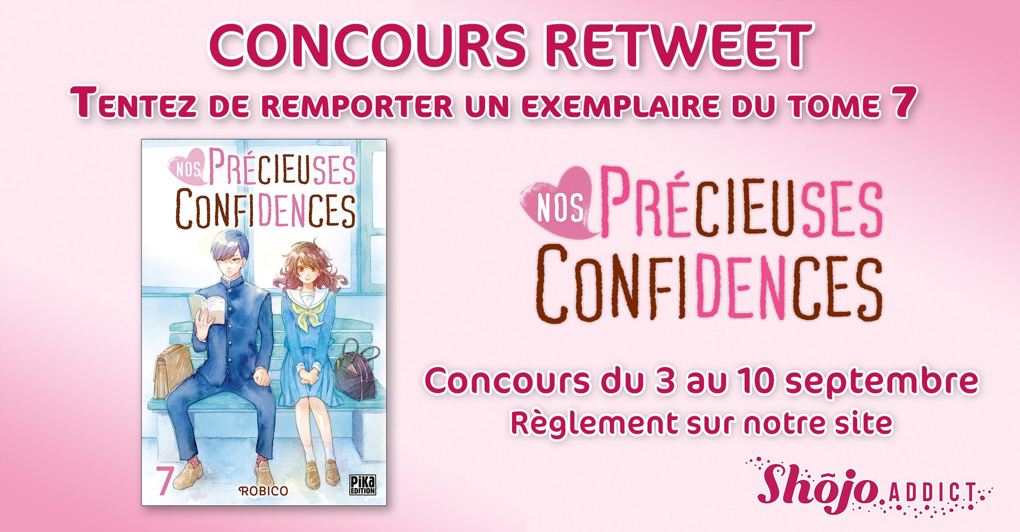 [CONCOURS RT] NOS PRÉCIEUSES CONFIDENCES ⭐️ À l'occasion de la sortie du tome 7 de "Nos précieuses confidences", nous vous proposons un jeu-concours pour tenter de remporter un exemplaire du tome 7 ! ⭐️ 1. Abonnez-vous à @sohojo_addict, 2. Likez et RT jusqu'au 10/09