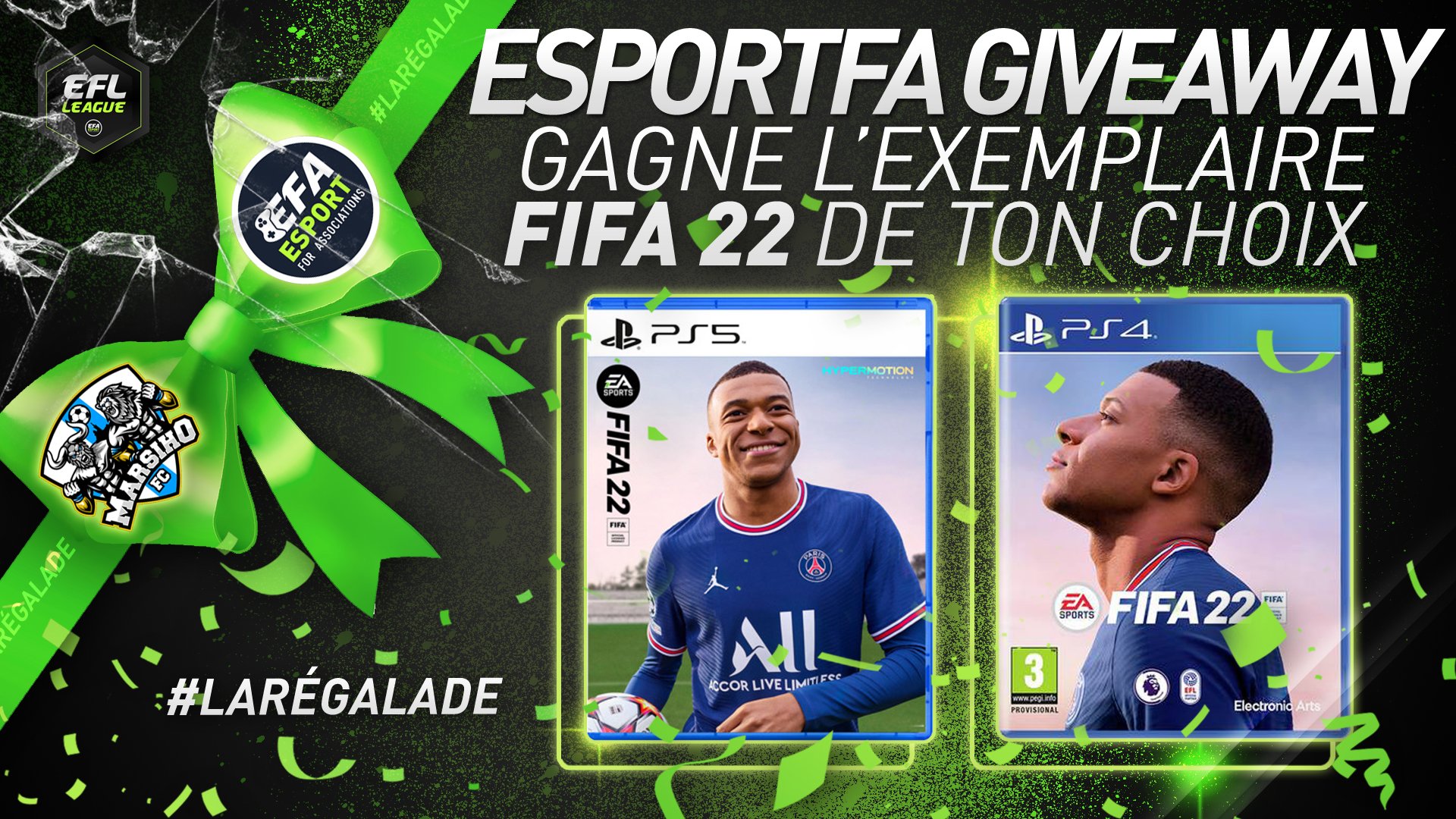 Pour fêter notre sélection en Esport Football League on te fait gagner un jeu #FIFA22 sur la plate-forme de ton choix ⚽️🎮 Pour cela : 1️⃣RT le tweet 2️⃣Follow @MarsihoF & @eSportFA_FR 🎲 TAS le 1er Octobre #ESPORTFA22
