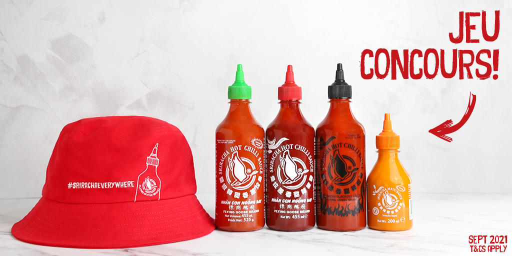 FOLLOW & RT pour tenter votre chance de #GAGNER cette sélection de sauces Sriracha Flying Goose ainsi qu’un bob ! Ce lot comprend notre sauce Sriracha originale, notre Sriracha extra forte, notre Sriracha Blackout et notre Mayo Sriracha! 🌶️