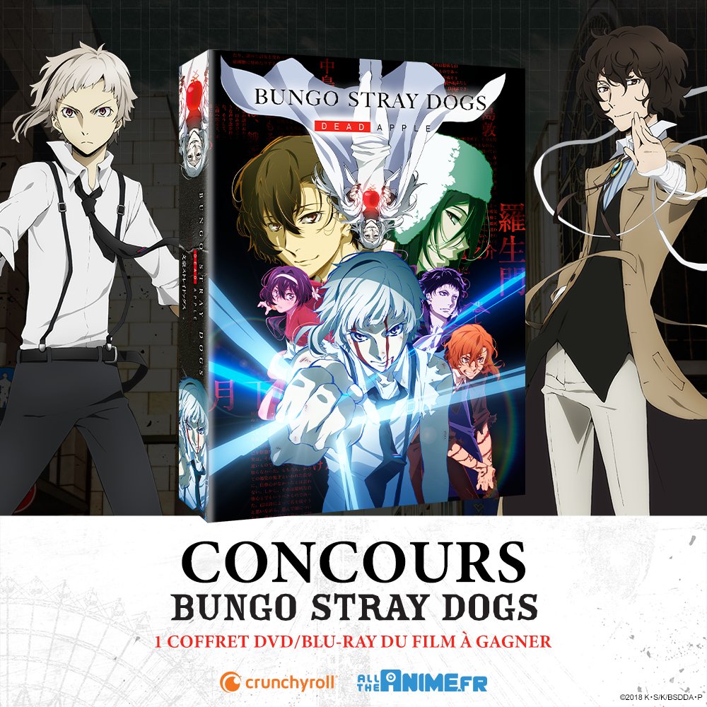 🎁 CONCOURS BUNGO STRAY DOGS 🎁 À l'occasion de la sortie en DVD/Blu-ray du film Bungo Stray Dogs - Dead Apple, tentez de remporter un exemplaire du coffret ! 🍎 ✨ CONDITIONS ✨ - Follow @alltheanime_fr & @Crunchyroll_fr - RT ce tweet - Commenter avec ton perso préféré