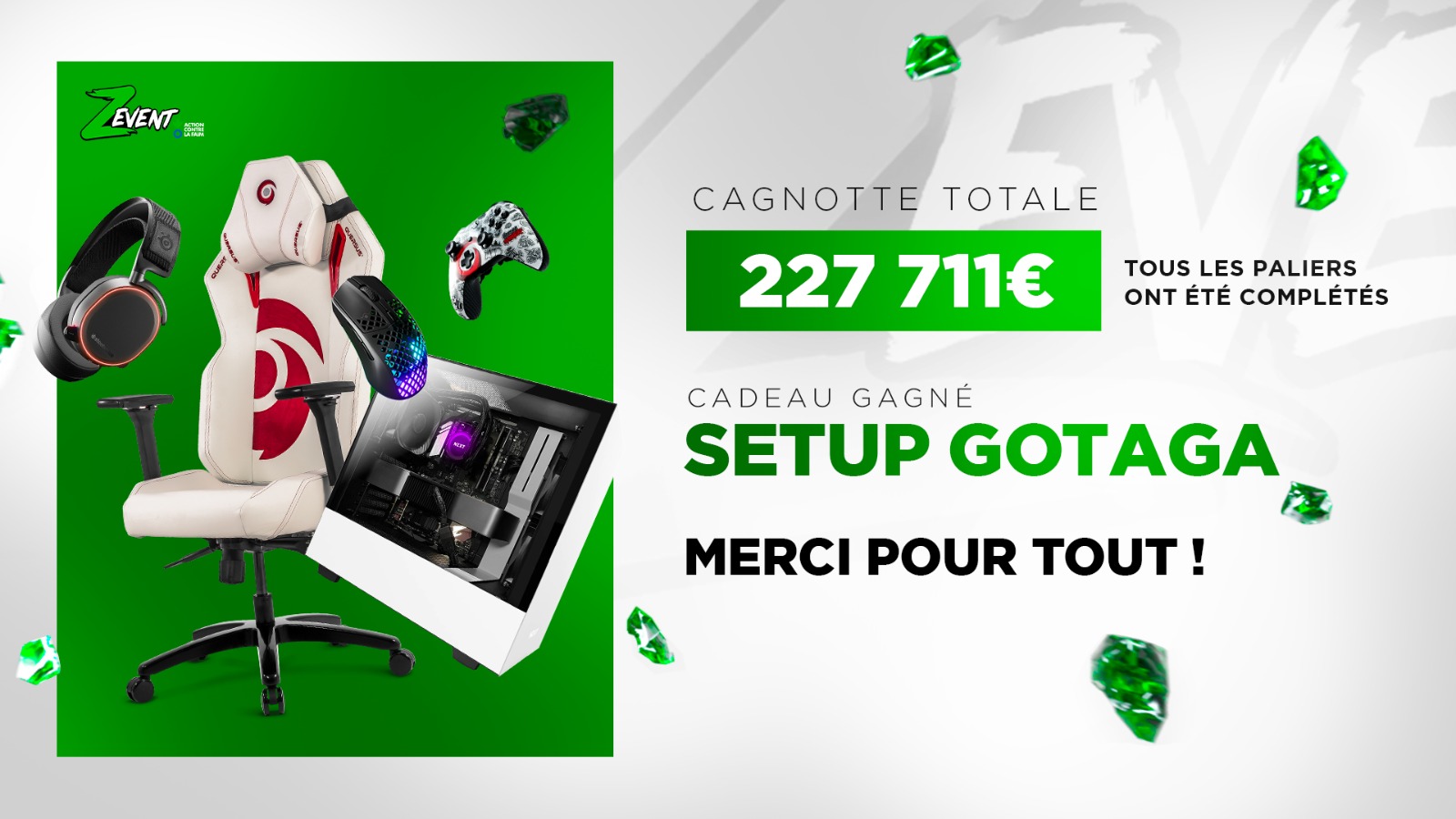 ✅ 227.711€ Pour clôturer ce #ZEVENT2021 et vous remercier de votre générosité ce weekend, quoi de mieux qu'un giveaway 🤗 On vous fait gagner le setup complet de @Gotaga 🤩 Pour participer, #RT et #Follow @GotagaTV ! T.A.S le 07/11