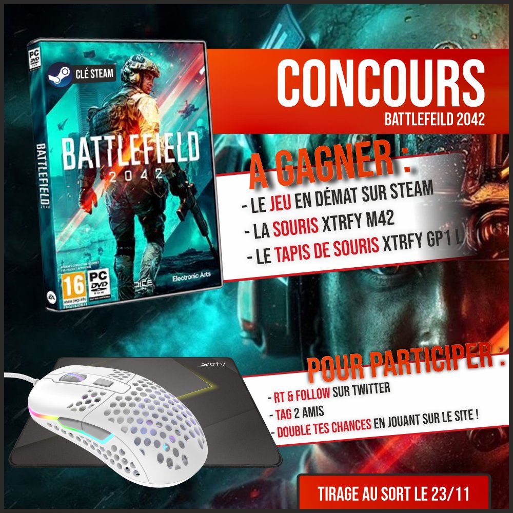 • 1 lot composé de 1 clé du jeu Battlefield 2042 + 1 souris + 1 tapis +1 hoodie valeur 165 €
