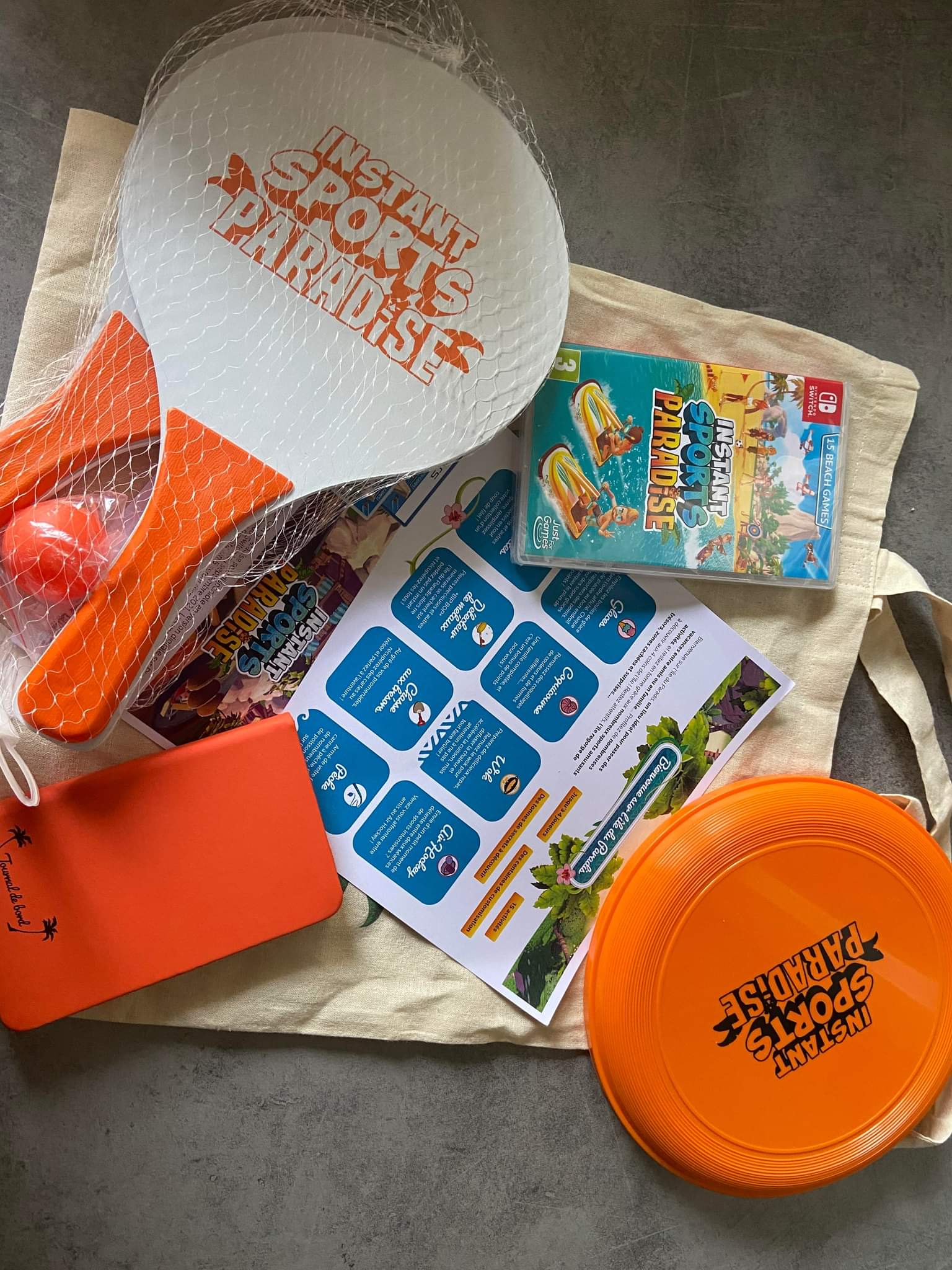 • 1 jeu vidéo Switch "Instant Sports Paradise" + 1 sac bandoulière + 1 Freesbee + 1 jeu de raquettes et balles + 1 bloc notes