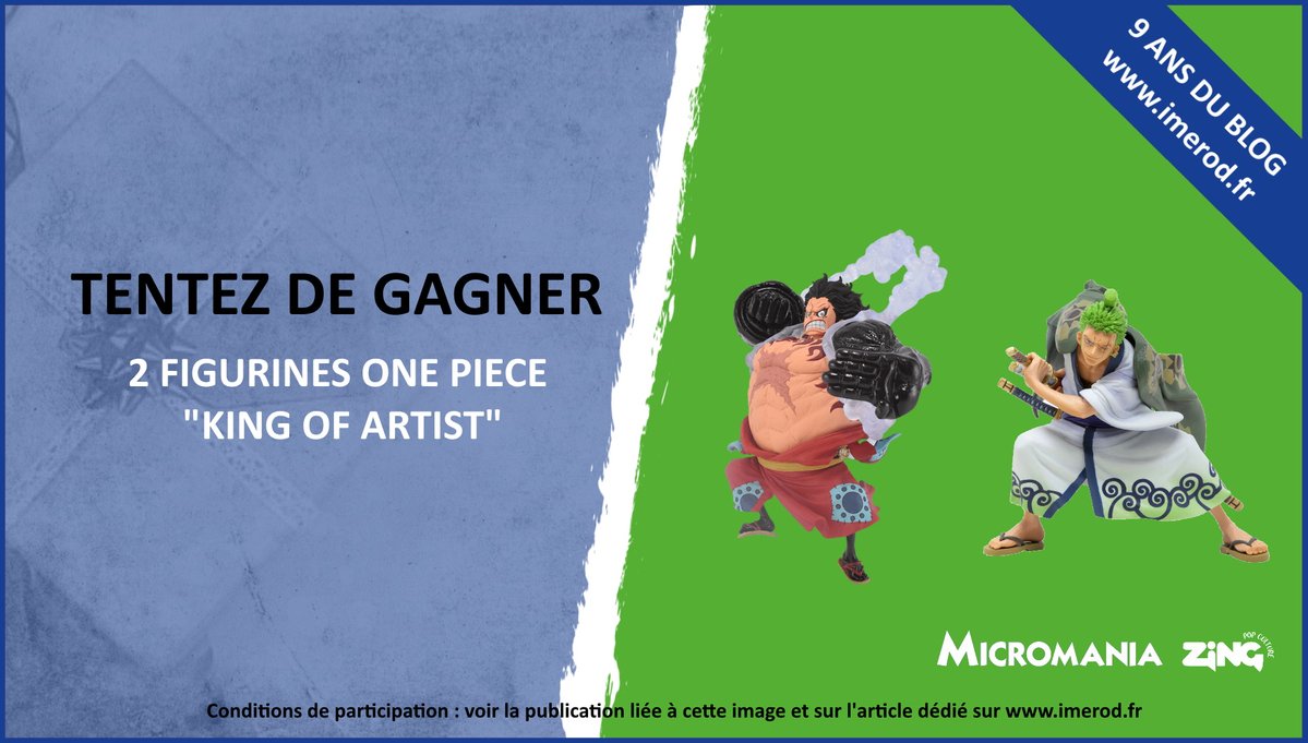 🔥#CONCOURS 9 ans du blog🔥 Tentez de gagner 2 figurines One Piece Banpresto "King Of Artist" Pour participer : - RT+Follow @imerodBlog & @Micromania_Fr - Tag un ami Participez aussi sur le blog : ⤵️ https://t.co/OaYZJx84gV