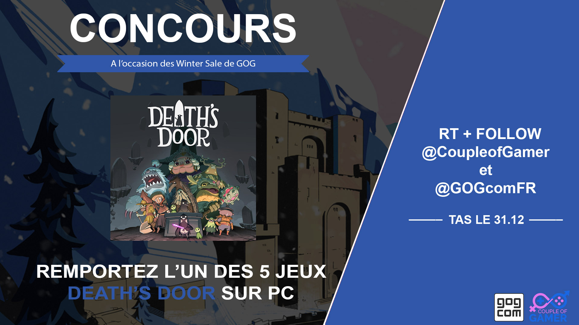 #Concours - Pour fêter le lancement des Winter Sale de GOG Tentez de remporter l'un des 5 jeux Death's Door sur PC via #GOG Pour participer RT + Follow @CoupleOfGamer @GOGcomFR TAS le 31.12 🍀Bonne chance🍀 #GiveAway #CoG #DeathsDoor #WinterSale