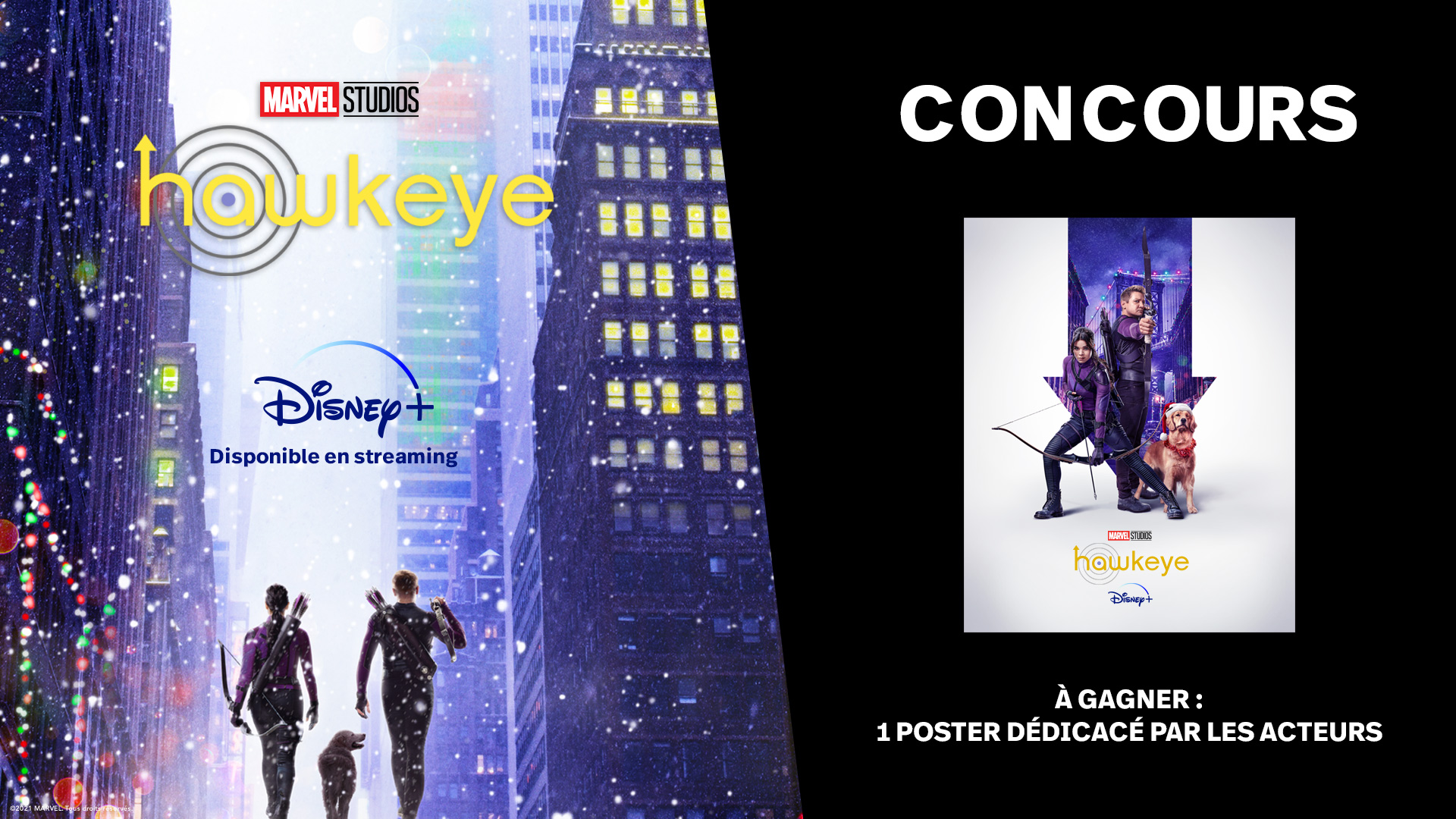 CONCOURS 🎁 À l'occasion des fêtes et de la disponibilité de tous les épisodes d'Hawkeye sur #DisneyPlus, RT pour tenter de remporter un poster dédicacé par une partie des acteurs.