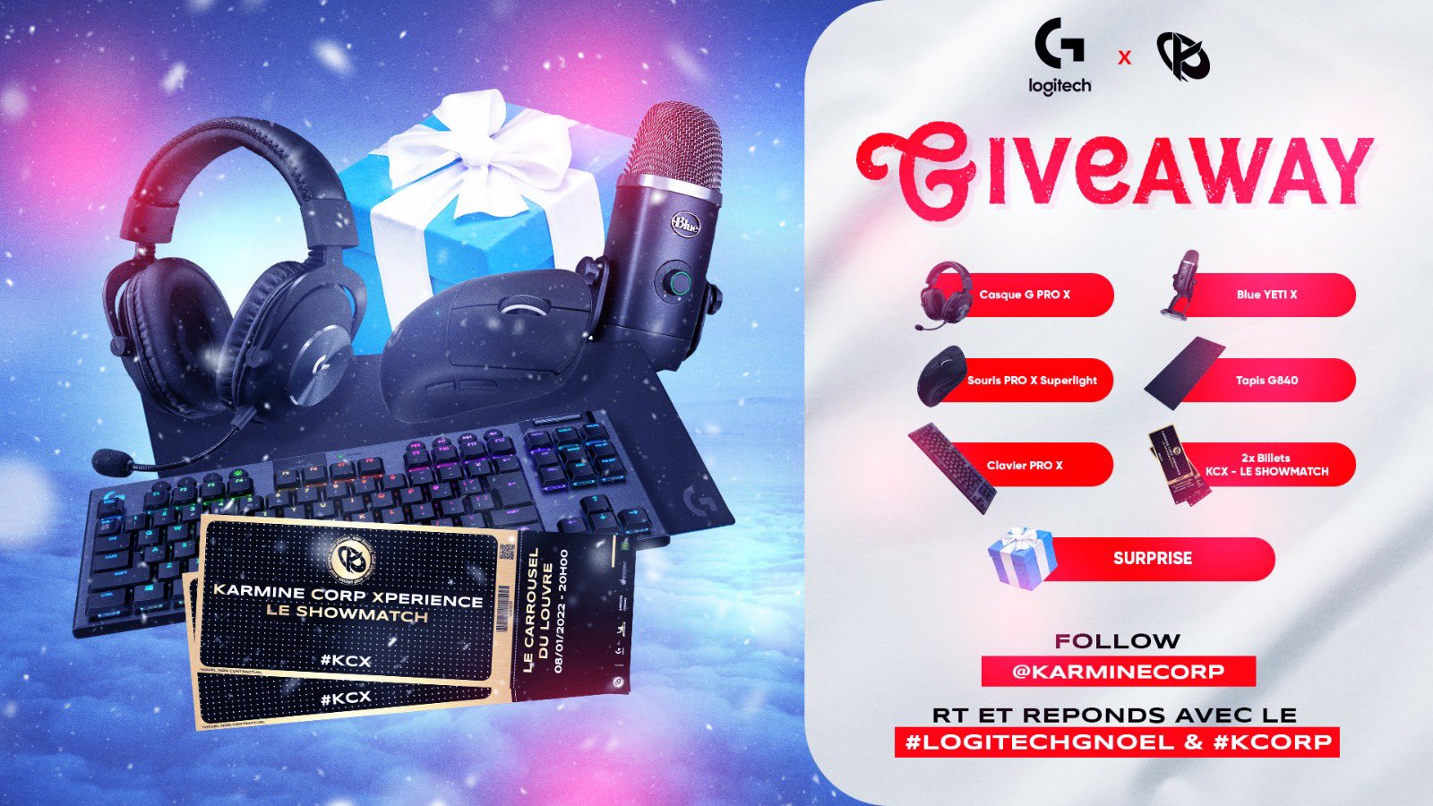 • 1 lot composé de 1 casque micro Logitech G Pro X + 1 micro Yeti X + 1 souris + 1 tapis + 1 clavier + 2 invitations pour le KCX Showmatch le 8 janvier à Paris + 1 surprise