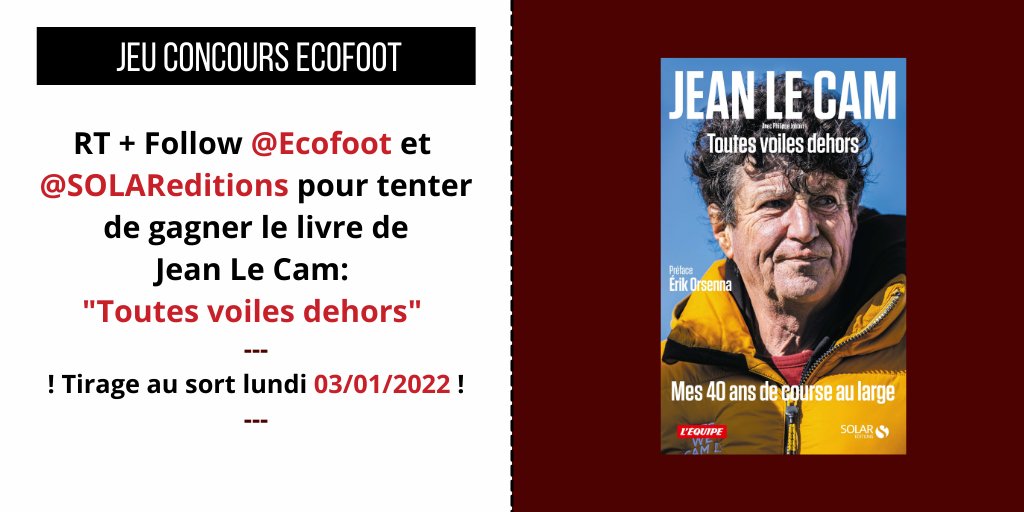🎁 JEU CONCOURS 🚨 👉 On vous fait gagner un exemplaire de l'ouvrage "Toutes voiles dehors" de Jean Le Cam Pour y participer : 1⃣ RT le tweet 2⃣ Follow @Ecofoot & @SOLAReditions 👉 Le gagnant sera désigné le 03.01.2022 Bonne chance à tous ! 🍀