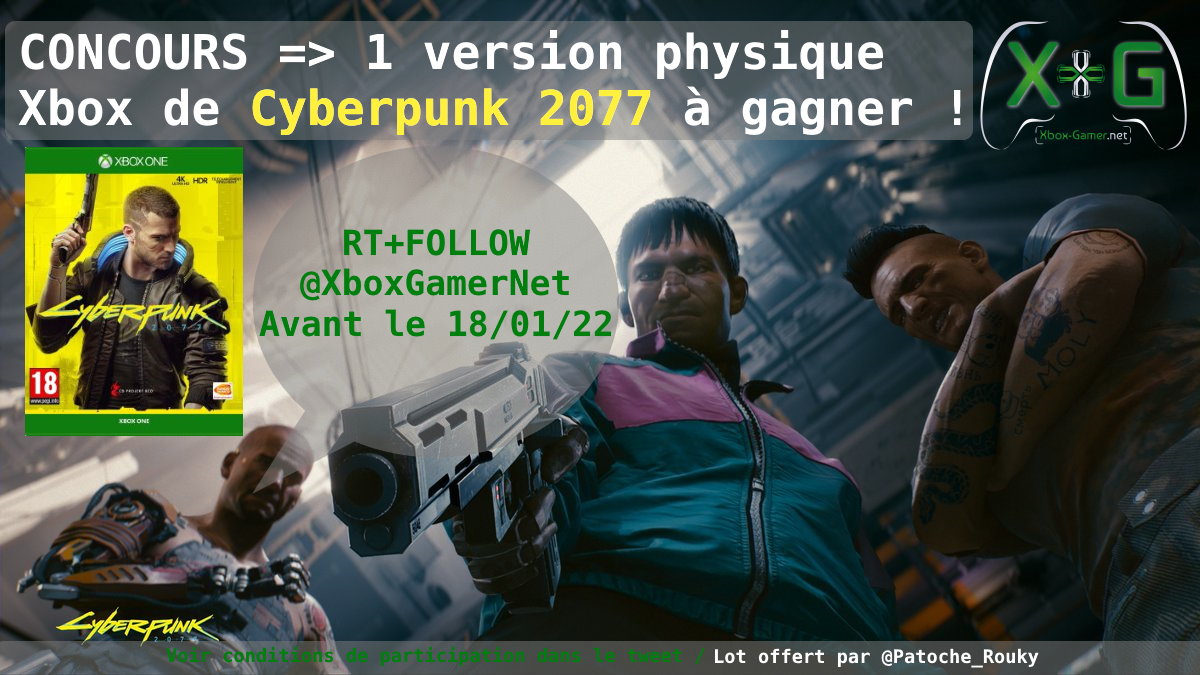 En attendant l'arrivée de la mise à jour new-gen de #Cyberpunk2077, @Patoche_Rouky vous fait gagner un exemplaire de la version physique #XboxOne du jeu de @CDPROJEKTRED. Pour tenter votre chance, il faut RT ce tweet et Follow @XboxGamerNet avant le 18 janvier 2022.